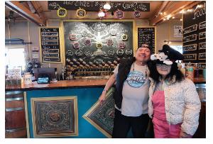 Leah and John in front of the Bushel and Barrel Cidar House menu