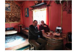 Leah and John in front of the Bushel and Barrel Cidar House menu